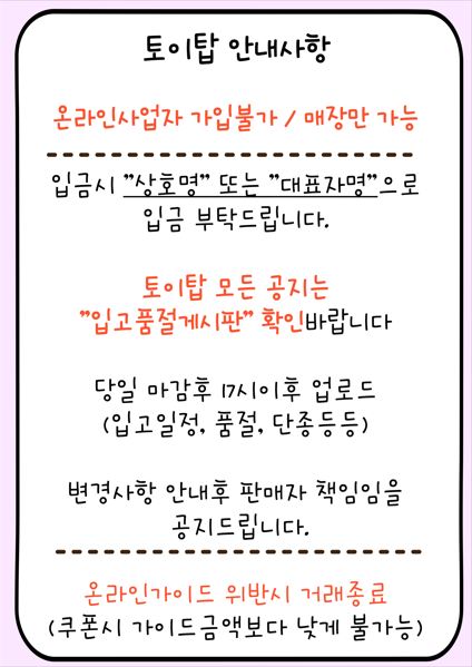 사업자 등록번호 : 125-86-05254 전화 : 031-372-7374 팩스 : 031-372-7375 이메일 : toytop2012@naver.com